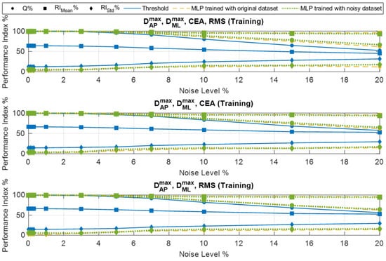 As a first novel contribution of this work, the behavior of the classification model in the case of noisy input data was investigated. The task of this study is to assess the system’s robustness against noisy data, which could resemble the effects of exogenous dynamics (e.g., possible tremors or involuntary movements) or could be introduced by the electronics that are used (including sensors). For this purpose, two different studies have been performed. The first study aimed to investigate the behavior of the model trained by the original dataset, while a noisy dataset was used during the inference phase. To accomplish this task, the original dataset was corrupted with different levels of gaussian noise and, with the aim of uniformly dirtying the dataset, the standard deviation of the noise for each feature was fixed as a percentage of its maximum absolute values. In particular, the following noise levels were used: 0.1%, 0.2%, 0.3%, 1.0%, 3.0%, 5.0%, 7.0%, 10.0%, 15.0%, and 20.0%. For each noise level, the corrupted data were used to feed both threshold and MLP models, while indexes (3), (5), and (6) were estimated based on the models’ predictions. The results of this analysis are shown in Figure 5 for both the training and test patterns during the inference phase.