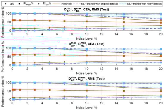 The second study investigated the convenience of also using noisy data to train the MLP model. To this end, a new training dataset called “Noisy dataset” was generated by merging the original training dataset (without noise) with the same data corrupted by five different levels (0.1%, 0.3%, 1.0%, 3.0%, and 5.0%) of noise. The results of this study are also shown in Figure 5.