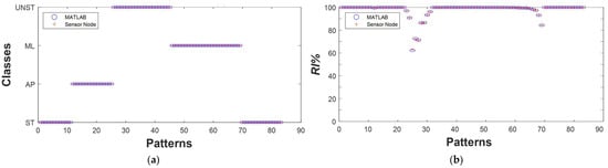 The second test was conducted to compare outcomes of the classification task performed by the sensing node and obtained in MATLAB®. As shown in Figure 7a, the two systems generate overlapping outputs that correspond to the expected postural dynamics.