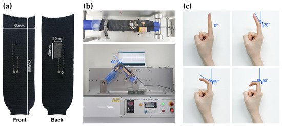 Dynamic bending tests were performed to verify whether the sensors could recognize complex finger movements and provide consistent measurements. The front and back sides of the sensors used in the experiment are presented in Figure 1a. The electrical characteristics of the sensors were evaluated using an E-textile flexing tester (CKFT-T400, Netest, Hwasung-si, Republic of Korea), as shown in Figure 1b. Prior to testing, each sample was subjected to 5 pre-bending cycles to ensure stable and uniform electrical signals [23]. The dynamic bending tests were performed for 1000 cycles each, with bending angles of 30°, 60°, and 90°, at speeds of 10, 30, and 50 cycles per minute (cpm). These bending angles were chosen to simulate actual finger movements, and the corresponding finger motions for each angle are shown in Figure 1c.
