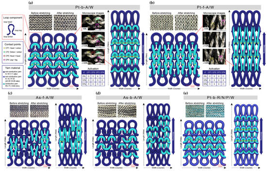 The changes in contact points before and after stretching for Pt-b-A/W are shown in Figure 2a. Before stretching, interlocking contacts (CP1, CP2, and CP4) and a jamming contact (CP3) are seen to coexist. After 10% strain, however, the CP1, CP2, CP3, and CP4 contacts have all transitioned into interlocking contacts. By contrast, the Pt-f-A/W exhibits interlocking contacts (CP1 and CP4) and jamming contacts (CP2 and CP3) before stretching, as shown in Figure 2b. Moreover, while all of these contacts have switched to jamming contacts at 10% strain, they are seen to have reverted to interlocking contacts and jamming contacts at 20% strain. The same contact point changes are observed for As-f-A/W, as shown in Figure 2c. However, because the conductive yarns are randomly arranged front and back, the number of contact points is relatively lower than Pt-f-A/W. Meanwhile, As-b-A/W exhibits the same contact point changes as Pt-b-A/W, as shown in Figure 2d, but with a reduced number of contact points due to the irregular arrangement of yarns. Finally, Pt-b-R/N/P/W has the same structure as Pt-b-A/W but exhibits different contact point changes due to the use of elastic yarns, as shown in Figure 2e. The high elasticity causes high pressure to be applied between loops before stretching, and structural deformation progresses slowly during stretching, thus resulting in minimal changes in the number of contact points. This structural analysis helps to understand the differences in sensing mechanisms depending on the arrangement of conductive yarns and the presence or absence of elastic yarns, thus providing foundational data for the electrical characterization.