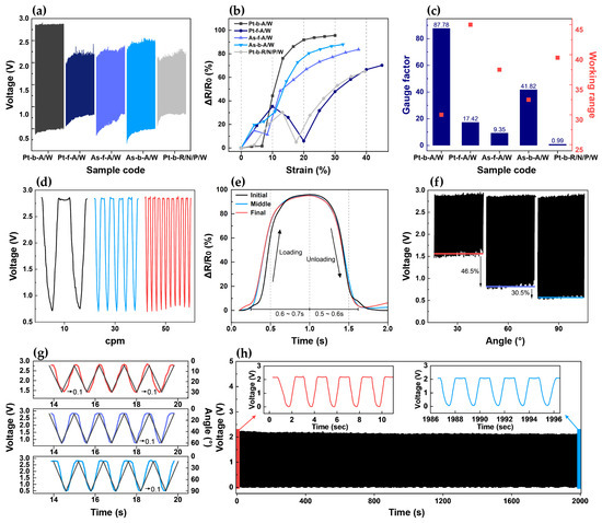 Dynamic bending test results for the five samples, along with an in-depth analysis of the results for Pt-b-A/W: (a) voltage outputs of the five samples during 1000 bending cycles at 90°; (b) relative resistance changes of the five samples at 90° and 30 cpm; (c) the corresponding GF values and working ranges; (d) voltage fluctuations of Pt-b-A/W according to bending speed at 90°; (e) loading and unloading times at the beginning, middle, and end of 1000 cycles at 90° and 30 cpm; (f) voltage outputs during 1000 cycles of bending to angles of 30°, 60°, and 90° at 50 cpm; (g) voltage change at angles of 30°, 60°, and 90° at 50 rpm; and (h) voltage changes during 1000 cycles at 90° and 30 cpm.