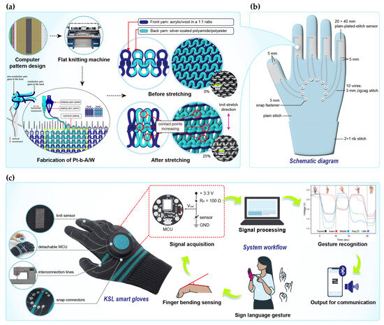 The fabrication, integration, and implementation of a smart glove for KSL gesture recognition: (a) fabrication of the plain-plated-stitch sensor and sensing mechanism; (b) a schematic diagram of the smart glove integrating the sensor, interconnection lines, and snap buttons; (c) photographic image showing the process of recognizing KSL gestures using the as-developed smart glove.