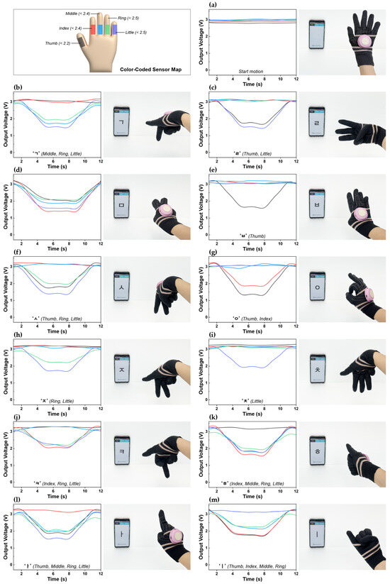 Before finger movement, the baseline output voltage ranges from 2.75 to 3.04 V (Figure 5a). When specific fingers are bent to represent Korean consonants and vowels, distinct voltage patterns are observed. For instance, during the ‘ᄀ’ motion involving the middle, ring, and little fingers, the voltage drops to 1.71, 1.89, and 1.48 V, respectively (Figure 5b). During the ‘ㄹ’ motion, which involves the thumb and little fingers, the voltage drops to 1.66 and 1.44 V, respectively (Figure 5c). For the ‘ㅁ’ motion, which involves all five fingers, the voltage drops to 2.02, 1.39, 1.88, 2.06 and 1.57 V, respectively (Figure 5d). During the ‘ㅂ’ motion, which involves only the thumb, the voltage drops to 1.6 V (Figure 5e). For the ‘ㅅ’ motion, which involves the thumb, ring finger, and little finger, the voltage drops to 1.74, 1.99 and 1.39 V, respectively (Figure 5f). The ‘ㅇ’ motion, which involves the thumb and index fingers, causes the voltage to drop to 1.36 and 1.85 V, respectively (Figure 5g). For the ‘ㅈ’ motion, which involves the ring and little fingers, the voltage drops to 2.2 and 1.72 V, respectively (Figure 5h). During the ‘ㅊ’ motion, which involves only the little finger, the voltage drops to 1.87 V (Figure 5i). For the ‘ㅋ’ motion, which involves the index, ring, and little fingers, the voltage drops to 2.05, 2.16, and 2.06 V, respectively (Figure 5j). The ‘ㅎ’ motion, which involves the index, middle, ring, and little fingers, causes the voltage to drop to 1.58, 1.78, 1.95, and 1.79 V, respectively (Figure 5k). When performing the ‘ㅏ’ motion, which involves the thumb, middle, ring, and little fingers, the voltage drops to 1.82, 1.95, 1.79, and 1.54 V, respectively (Figure 5l). Finally, the ‘l’ motion, which involves the thumb, index, middle and ring fingers, causes the voltage to drop to 1.71, 1.75, 2.11, and 2.25 V, respectively (Figure 5m).