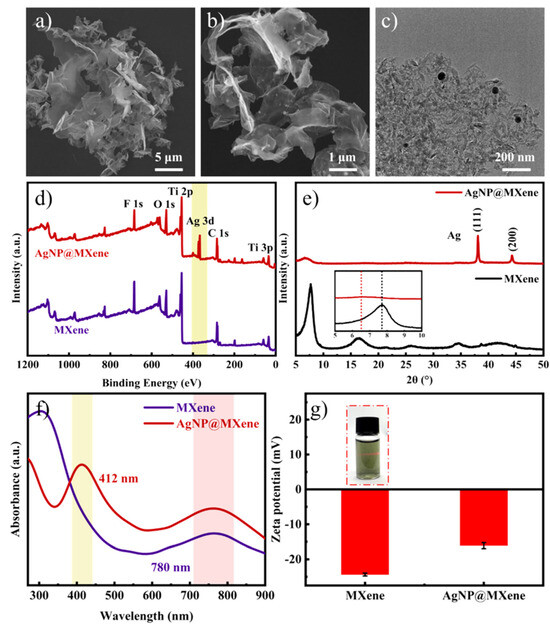 (a) SEM image of multi-layer MXene. (b) SEM image of AgNP@MXene. (c) TEM image of AgNP@MXene. (d) XPS survey spectra of MXene and AgNP@MXene. (e) XRD patterns of MXene and AgNP@MXene. (f) UV–Vis absorption spectra of MXene and AgNP@MXene. (g) Zeta potential of MXene and AgNP@MXene.