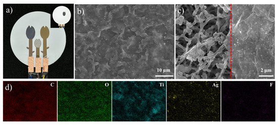 Further FTIR spectroscopic analysis of the sample was performed, as shown in Figure S6. An absorption band was observed at approximately 3433.7 cm−1, indicative of the prevalence of hydrophilic groups on the surface of MXene. The SEM image of MXene writing on the A-side of the paper chip is shown in Figure S7. This figure demonstrates that the Ti3C2Tx nanosheets have been successfully attached to the MCE substrate and that the layer is dispersed more uniformly. This indicates that the working electrode surface of the paper chip was completely written, forming a continuous writing trace and achieving a continuous conductive pathway. The optical photomicrograph of the photothermally enhanced glucose detection paper chip is shown in Figure 2a. AgNP@MXene was deposited onto the B-side of the paper chip using a brush, and the SEM images of its writing traces at different magnifications are shown in Figure 2b. The MXene lamellae exhibited complete coverage of the MCE substrate, with the Ag nanoparticles being uniformly dispersed on the structure of the MXene lamellae. This suggests that the AgNP@MXene was completely written onto the surface of the MCE membrane, resulting in uniform coverage. As illustrated in Figure 2d, the EDS elemental mapping reveals the presence of the elements carbon, oxygen, titanium, silver, and fluorine. Figure 2c presents the SEM image of AgNP@MXene on the B-side of the paper chip, where the boundary of the writing trace is located. This method allows for the coverage of the underlying fibrous MCE membrane, and the writing boundary is visible.