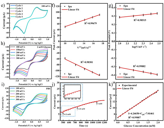 To further explore the electrochemical stability of the new paper chip, Figure 2e shows the CV curves of the paper chip in a solution of PBS. It can be observed that for a given paper chip, the five circles of CV curves essentially overlap, indicating that the paper chips exhibit adequate stability. The electrode reversibility of paper chips was tested and characterized using cyclic voltammetry. The detection area distribution of the paper chip was placed in a PBS solution, as illustrated in Figure 2f. The oxidation peak potential exhibited a positive shift with an increase in scanning speed, while the anodic peak current value demonstrated a corresponding increase. Conversely, the reduction peak potential shifted negatively with an increase in scanning speed, increasing the cathodic peak current value. The effect of scanning speed (V) on the current and potential was also explored, as demonstrated in Figure 2h. As the scanning rate was increased from 100 mV/s to 300 mV/s, the redox current response value increased gradually. By comparing the cyclic voltammograms in 2 mM glucose aqueous solution and PBS solution, as shown in Figure 2h,i, it can be seen that the electrode undergoes redox reactions regardless of the presence of glucose [33]. In the absence of glucose, GOx-FAD undergoes a reduction reaction at the electrodes to form GOx-FADH2, and GOx-FADH2 is re-oxidized by oxygen, producing H2O2 in this process. Therefore, the electrochemical mechanism can be further determined based on the presence or absence of glucose oxidase in the electrode, as shown in Figure S8. It is evident that in the absence of glucose oxidase, the cyclic voltammograms do not exhibit a redox peak. Therefore, it can be determined that the redox reaction comes from glucose oxidase. The CV curve demonstrates the electrochemical response of the MXene-based glucose sensor. The primary oxidation peak at approximately 0.25 V corresponds to the oxidation of H2O2 generated from the GOx-catalyzed reaction (H2O2 → O2 + 2H+ + 2e−). The reduction peak around −0.4 V should be the reduction of FAD to FADH2 (Scheme 1) caused by accepting the electrons generated from glucose dehydrogenation (FAD + 2H+ + 2e- → FADH2) [34]. A weak oxidation peak observed at higher potentials (~0.8 V) may originate from the oxidation of functional groups on the MXene surface [35]. As illustrated in Figure 2f,g, as the scan rate increases, the redox current response value progressively rises, displaying a strong linear correlation between the redox peak current and the square root of the scan rate, with R2 values of 0.99679 and 0.98381, respectively. Similarly, a robust linear relationship is observed between the redox peak potential and logV, with R2 values of 0.98515 and 0.99882, respectively. This illustrates that the electrochemical process of glucose oxidation on the MXene-modified electrode is a diffusion-controlled electron transfer process [36]. Furthermore, the oxidation potential of glucose increases in direct proportion to the scan rate. The results obtained demonstrate that the paper chip exhibits excellent electrochemical stability. The position of the oxidation peak was obtained from the CV curve, the voltage value was determined, and the IT curve of the current value and the glucose concentration response were further determined. The real-time response curve of the paper chip to glucose solution was determined by the time–current method to investigate the detection effect of the paper chip on glucose testing. As shown in Figure 2j, a swift response in the current was observed upon the addition of glucose, with the concentration response ranging from 0.12 mM to 2 mM. The paper chip exhibits a high degree of sensitivity to glucose, with each drop of glucose solution eliciting a discernible current response. The current value of the response step in Figure 2j is plotted against the glucose concentration in the actual solution. A scatter plot is then generated and fitted to obtain a curve of the relationship between the current response value and the glucose concentration, as shown in Figure 2k. It is evident that in the simulated human sweat environment, affected by the glucose concentration, the current signal responds linearly.