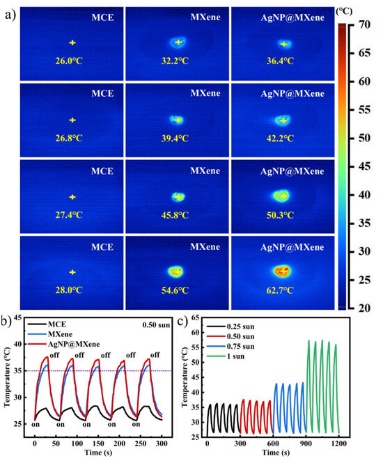 (a) Infrared thermal images of the B-side of MCE film, MXene, and AgNP@MXene paper chips after irradiation for 10 s with different optical powers (0.25 sun, 0.50 sun, 0.75 sun, 1 sun). (b) Heating–cooling cycle of the MCE membrane, MXene, and AgNP@MXene paper chip A-side. (c) Cyclic stability curve of AgNP@MXene paper chips.