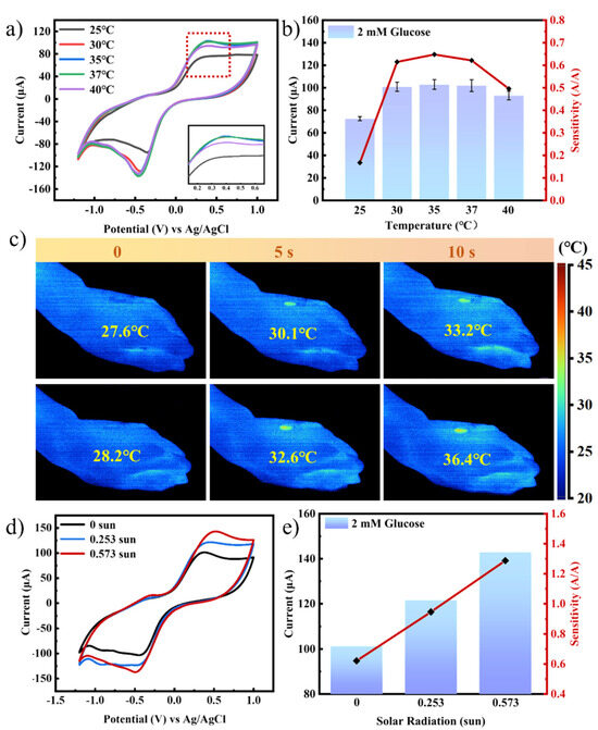 (a) Cyclic voltammetry curves of paper chips. (b) Oxidation peak current value and sensitivity of the paper chip. (c) Infrared thermal images of the temperature of the B-side of the paper chip after 10 s (0.253 sun, 0.573 sun). (d) Cyclic voltammetry curves of paper chips under noonday solar illumination. (e) Oxidation peak current values and detection sensitivity of paper chips under noonday solar illumination.