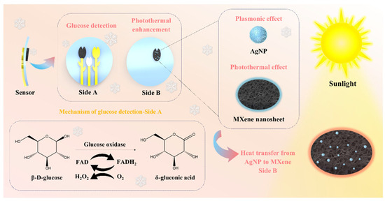 In this work, we developed a photothermal paper chip electrochemical sensor for glucose detection in sweat at low temperatures. MXene is a new class of two-dimensional materials consisting of layered compounds of transition metal and carbon or nitrogen. The general chemical formula is usually written Mn+1XnTx, where M represents the transition metal, X represents carbon or nitrogen, and Tx is a surface-modified functional group. MXene is obtained by selectively etching the aluminum layer in MAX-phase materials (e.g., Ti3AlC2) and exfoliating it. MXene has a unique lamellar structure and exhibits high electrical conductivity and mechanical strength. The abundance of functional groups on its surface also gives it good hydrophilicity and tunable chemical properties [21,22,23,24,25,26]. The use of this material has been extensively applied in the field of wearable sensor development and electrocatalytic transformations [27,28,29,30,31]. The development of a double-sided, three-electrode, paper-based chip for the detection of glucose in sweat at low temperatures utilizing an enzymatic reaction mechanism was the objective of this study. As demonstrated in Scheme 1, where the A-side provides glucose detection capability, the ink containing monolayer MXene and GOx is utilized as the working electrode, and the AgNP@MXene ink on the B-side provides the photothermal conversion capability. In the context of glucose electrochemical detection, FAD (oxidized flavin adenine dinucleotide) constitutes the active central prosthetic group of GOx. Upon the oxidation of glucose, the FAD molecule accepts two electrons and two protons, undergoing a reduction to form the FADH2 compound. The incorporation of monolithic layers of MXene and Ag nanoparticles not only enhanced material stability but also increased the specific surface area, improving the electrical conductivity and electrochemical properties. The photothermal enhancement effect is achieved through the dual LSPR effect of Ag nanoparticles and MXene, significantly improving detection sensitivity in low-temperature environments and extending the paper chip’s usable temperature range to 25–37 °C [32]. It is anticipated that this advancement will enable applications in the field of wearable flexible electronics in the future.