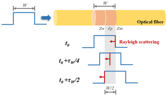The theoretical model of OTDR is schematically illustrated in Figure 1. An optical pulse with temporal width τW (corresponding to spatial width W) is launched into the FUT. At time t0, the leading edge of the pulse reaches the fiber position zm, generating Rayleigh scattered light Rzm. During the process of Rzm returning to the starting position of the FUT, it encounters and combines with the Rayleigh scattered lights generated by the excitation of the pulse at other positions, and returns to the starting position of the FUT together. For example, at time t0 + τW/4, Rzm arrives at the fiber position zp, where the propagating pulse simultaneously generates backscattered Rayleigh light Rzp. These two scattered lights (Rzm and Rzp) then co-propagate back toward the detection system. Similarly, when t0 + τW/2 is reached, both Rzm and Rzp arrive at position zn, where the trailing edge of the pulse excites additional backscattered Rayleigh light. This newly generated light combines with the existing Rzm and Rzp, forming a composite backward-propagating signal. As the pulse continues propagating beyond zm, newly generated scattered lights cease to overlap with Rzm. Consequently, the detected backscattered signal ultimately comprises only those generated between the fiber positions zn and zm. This demonstrates that the Rayleigh scattered signal received at the detection system when the pulse reaches zm does not originate exclusively from zm, but rather from the superposition of all backward-scattered lights generated within a spatial interval corresponding to half the pulse width (W/2). The backscattered light generated at different times can combine at the same location because the incident pulse has a certain spatial width, and the backscattered signals generated by the leading and trailing edges of the pulse at different times converge during the transmission process. The above analysis indicates that when a pulse light with spatial width W is injected into an optical fiber, only the Rayleigh backscattered light generated within the range of W/2 can encounter each other and simultaneously reach the starting position of the optical fiber. This range is called the effective scattering zone, which determines the spatial resolution of the OTDR.