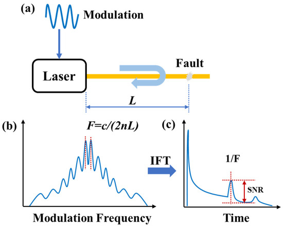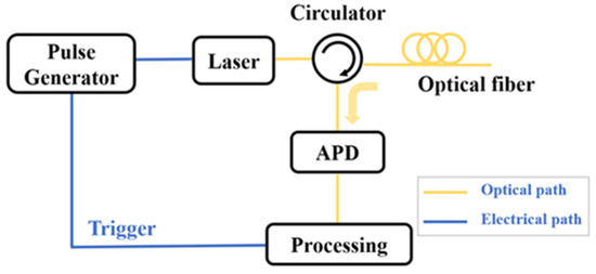 The schematic architecture of a typical OTDR system is illustrated in Figure 2 [9,10]. A pulse generator produces electrical driving signals that modulate a laser source, generating synchronized optical pulses. The pulse period is determined by the length of FUT and ensures that only one pulse can be transmitted in the optical fiber. These optical pulses are subsequently directed into the FUT through an optical circulator. The backscattered signals along the optical fiber are converted into electrical signals by an avalanche photodiode (APD) and then enter the data processing unit for analysis. The pulse generator needs to be triggered by the data processing unit to maintain the synchronization of the data. By detecting the intensity variations in the backscattered signals and Fresnel reflection signals along the FUT, the attenuation information and the length of the FUT can be measured; meanwhile, the loss and fault events can also be determined.