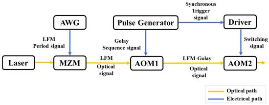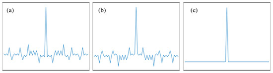 In 1989, M. Nazarathy and S. A. Newton et al. [15] formally introduced and experimentally demonstrated a complementary correlation technique based on Golay codes. Golay sequences consist of a pair of sequences A(k) and B(k) composed of −1 and 1, taking the 32 bit complementary sequences A (32) and B (32) as an example. Figure 6a and Figure 6b, respectively, show the shapes of their autocorrelation functions. It can be observed that both exhibit significant sidelobes, and their sidelobes are complementary. Figure 6c displays the sum of the two, where the sidelobes are completely eliminated. Unlike pseudorandom codes, Golay codes consist of two complementary sequences. Although the autocorrelation curve of each individual sequence contains sidelobes, their summation produces zero residual sidelobes.