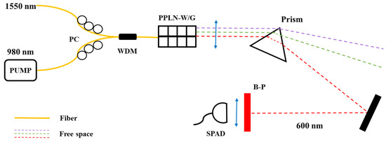 In 2007, M. Legre et al. [38] achieved centimeter-scale spatial resolution based on the up-conversion process in PPLN waveguides and low-time-jitter silicon photonic counting modules. The sum frequency generation (SFG) photon-counting module architecture is illustrated in Figure 7. This configuration utilizes SFG technology to combine a 1550 nm photon with a 980 nm photon, generating a 600 nm output photon. The upconverted light (600 nm) subsequently undergoes spectral filtering through a prism and interference filter before final detection by an SPAD.
