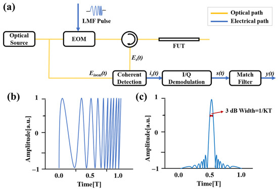 (a) OTDR schematic of pulse compression based on LFM technology; (b) time-domain shape of LFM pulse; (c) the compressed pulse with a 3 dB width of 1/KT.