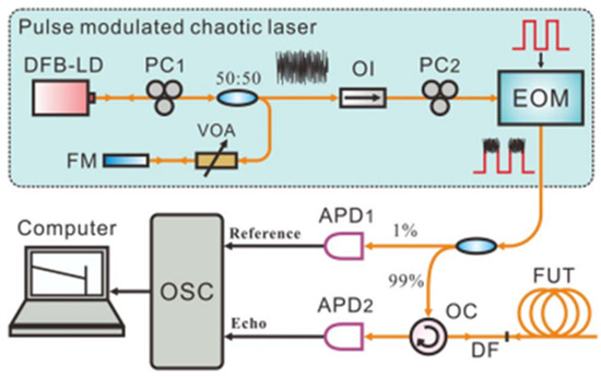 - Wang, Y.C.; Wang, B.J.; Wang, A.B. Chaotic Correlation Optical Time Domain Reflectometer Utilizing Laser Diode. IEEE Photonics Technol. Lett. 2008, 20, 1636–1638. [Google Scholar]