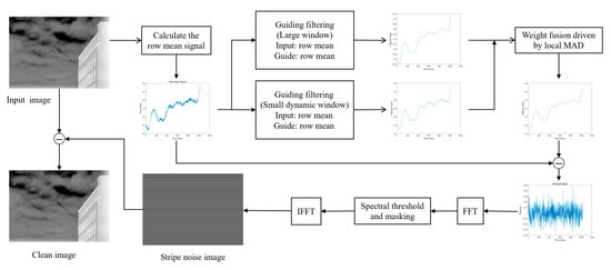 - Frequency-domain filtering-based methods: the two-stage filtering (TSF) approach proposed by Zeng in 2018 [36] combines frequency-domain filtering with one-dimensional row-guided filtering, aiming to remove stripe artifacts while preserving image structures.
