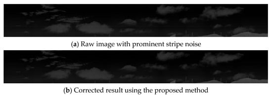 - Hamadouche, S.A. Effective three-step method for efficient correction of stripe noise and non-uniformity in infrared remote sensing images. Phys. Scr. 2024, 99, 065539. [Google Scholar] [CrossRef]