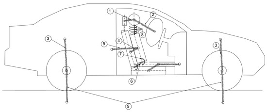 This dimensional accuracy was essential for ensuring that the multibody system behaves realistically during impact scenarios, particularly in replicating suspension kinematics and occupant–seat interactions. The principal dimensions of the vehicle model and the associated reference points are presented in