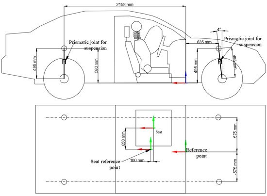 Figure 4 highlights the vehicle’s main reference point, which serves as a fixed origin for global positioning within the simulation environment. In the top view, the layout of the seat relative to the vehicle structure is illustrated, including the seat reference point positioned 100 mm rearward of the global reference point, ensuring the accurate placement of the occupant model within the cabin. The distances between the suspension mounting points across the vehicle width are also detailed, supporting the symmetrical construction of the chassis in the model.