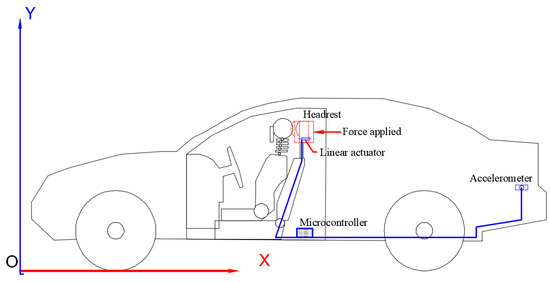28]. In the context of active headrest systems, acceleration sensors play a critical role by detecting the onset of rear-end collisions. Upon registering a sudden longitudinal acceleration that exceeds a predetermined threshold—typically around 50 m/s