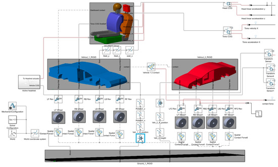 The complete model consists of several interconnected components designed to accurately replicate the dynamics of a rear-end collision scenario. The vehicle structure is modelled as a single rigid body, connected to the four wheels through suspension systems represented by prismatic joints with spring–damper elements (presented in