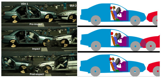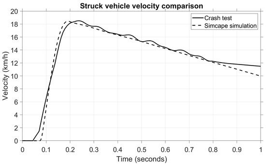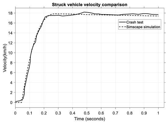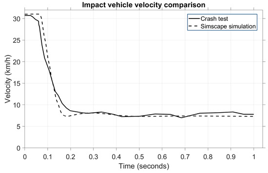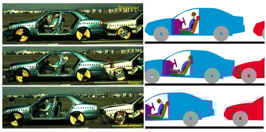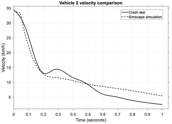 Figure 13. The crash test was carried out at 33 km/h with the same vehicles and the same dummy as in the frontal impact with identical parameters. This comparison validates the mathematical model for rear-end collisions by comparing the kinematic and dynamic values.
