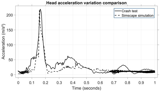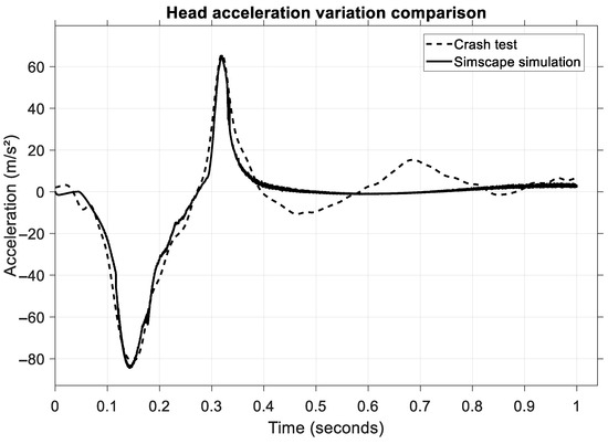 To validate the model numerically, a comparison of vehicle velocities and head acceleration values was carried out. The first result is the head acceleration, shown in