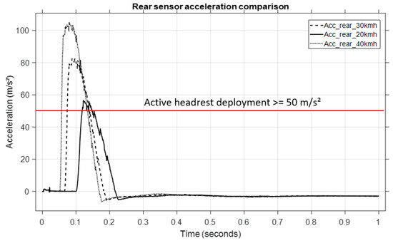 Every velocity causes the acceleration to approach or surpass values near 50 m/s2, which was chosen as the active headrest system’s activation threshold.