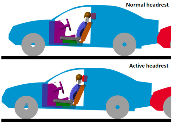 A key innovation introduced in this work is the inclusion of an active headrest system, which is controlled via an integrated longitudinal acceleration sensor and a dedicated logic circuit. Upon detecting a rear-end impact exceeding a defined acceleration threshold, the system actively displaces the headrest to limit head–torso relative motion. Simulation results across various collision speeds (20, 31, and 40 km/h) confirmed the effectiveness of the active headrest in significantly reducing peak head accelerations and mitigating potential whiplash injuries.