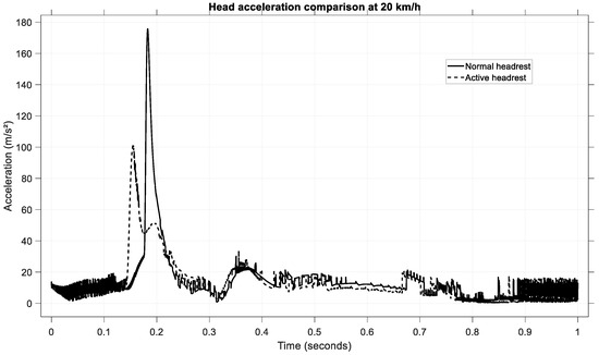 To further assess the effectiveness of the active headrest, the head linear acceleration was analyzed for a low-speed rear-end collision at 20 km/h.