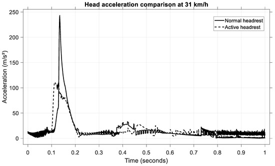 To validate the model under a medium-severity rear-end collision, simulations were performed at an impact speed of 31 km/h. The resulting head acceleration profiles for the passive and active headrest configurations are shown in