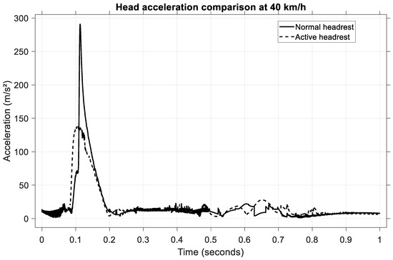 To assess the performance of the active headrest under high-severity impact conditions, a rear-end collision at 40 km/h was simulated. The head acceleration time histories for both passive and active headrest configurations are illustrated in