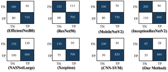 Figure 6. Confusion matrix outcomes illustrating the classification performance of various models: EfficientNetB0, ResNet50, MobileNetV2, InceptionResNetV2, NASNetLarge, Xception, CNN-SVM, and the proposed EDIL model.