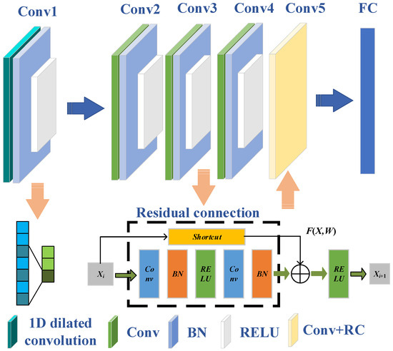 In response to the structural characteristics of the extracted feature vectors and the requirements of degradation recognition, 1D-DRCNN is established in this study. The network structure is shown in Figure 2. Compared with conventional convolution, the dilated convolution expands the receptive field without increasing the parameter number by introducing gaps using the dilation factor. The established network takes a one-dimensional single-channel signal of length 1000 as the input. The input data has a time sequence correlation, and the waveform details contain bearing degradation information. Therefore, the larger receptive field helps to reduce feature information loss and improve the overall recognition performance of the model. Initially, a 32-channel 1D dilated convolutional layer is applied. The kernel size is 32 and the dilation rate is 2. Then there are four convolutional layers with decreasing kernel widths of 32, 16, 8, and 8, respectively, while the number of channels varies as 32, 16, 32, and 64 in a decreasing-then-increasing pattern. This design enables the capture of broad local features and facilitates the focus on fine-grained information in deeper layers. Each convolutional layer is composed of a convolution operation, a batch normalization, and a ReLU activation function, enabling efficient multi-level feature integration and improved classification performance. To alleviate the gradient vanishing issue in deeper networks, a skip connection mechanism is introduced. Specifically, the output of the third convolutional layer is transformed by a 1 × 1 convolution and then added to the output of the fifth convolutional layer, forming a residual connection that enhances deep feature fusion. Finally, a fully connected layer maps the extracted features to nine target classes, and the final classification is achieved using a softmax activation followed by a classification layer.