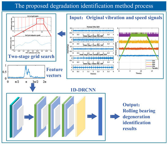This study proposes an identification method for rolling bearings under different degradation states, based on an improved monopulse feature extraction and 1D-DRCNN. The method first acquires bearing vibration signals and rotation speed signals, from which the signal envelope and fault phase function can be calculated. Subsequently, the improved monopulse feature extraction approach is employed. The two-stage grid search is used to rapidly calibrate FCC to enhance feature extraction efficiency and mitigate the influence of complex working conditions. This process generates the normalized waveform feature vectors. On this basis, the waveform features extracted using both inner and outer ring FCCs are concatenated to form a comprehensive feature vector. This vector characterizes the overall bearing degradation state. Finally, the 1D-DRCNN is constructed for feature fusion and classification. By making full use of the local features in a monopulse waveform, the model can effectively capture degradation information. Thus, the accurate bearing degradation identification under different working conditions can be achieved. The overall methodological framework is illustrated in Figure 3.