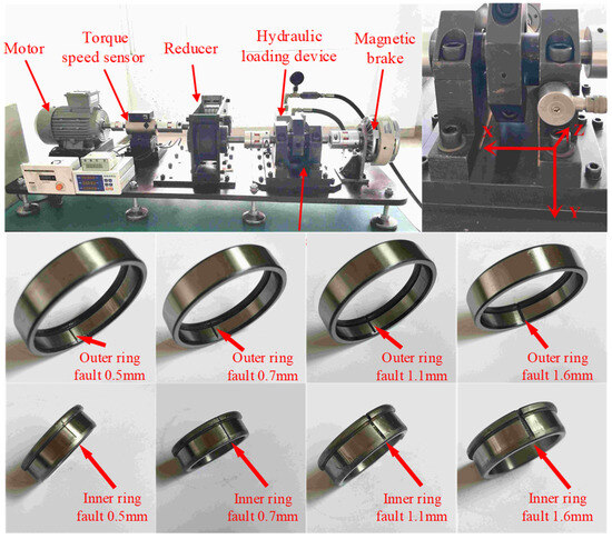 In this study, the NU1007 cylindrical roller bearing was selected as the research object. The outer race diameter is 55 mm, the inner race diameter is 42 mm, the roller diameter is 6.5 mm, and the rolling element number is 16. The experimental setup, sensor placement, and test bearing configuration are illustrated in Figure 4. The radial load was applied using a hydraulic loading device. A triaxial accelerometer was employed to collect the bearing vibration signals, and the sampling frequency was set as 20 kHz. The vibration sensor was mounted on the outer surface of the bearing housing, with the Z-axis signal—perpendicular to the contact surface and directed toward the bearing center—being selected for analysis. Under varying working conditions, the vibration and rotation speed signals of normal bearings and inner and outer race fault bearings with four different fault sizes were collected. All test bearings were installed in the right bearing housing. The four fault sizes are 0.5 mm, 0.7 mm, 1.1 mm, and 1.6 mm, respectively.