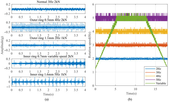 Some collected original data: (a) fault bearing vibration signal under different working conditions; (b) five rotational speed curves.