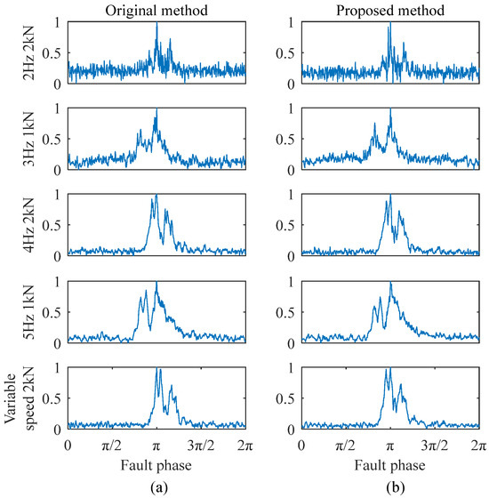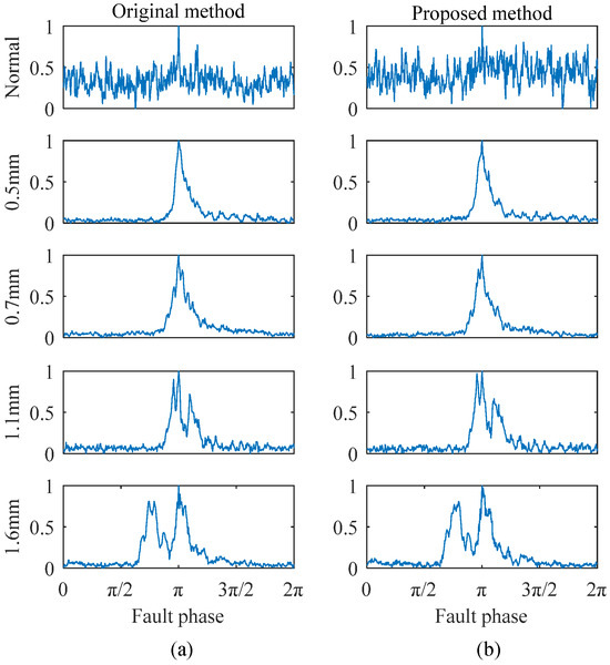 Feature extraction comparison for 1.1 mm outer ring fault under different conditions: (a) original method extraction results; (b) improved method extraction results.
