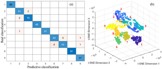 Recognition results and visualization analysis of established model: (a) confusion matrix; (b) result of t-SNE.