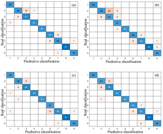 Confusion matrices of comparison models: (a) DilationNet; (b) DeepConvNet1D; (c) ResNet1D; and (d) InceptionNet1D.