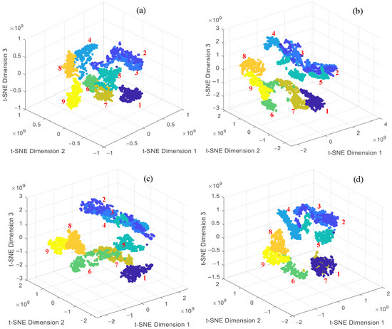 The t-SNE visual analysis of comparison models: (a) DilationNet; (b) DeepConvNet1D; (c) ResNet1D; and (d) InceptionNet1D.