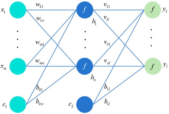 Here, f is a nonlinear function, also known as an activation function. and are indices of the number of neurons in hidden and output layers. and are constants which are set to 1 in this work.