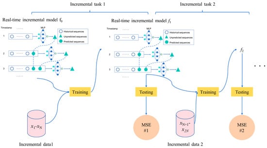 The structure of the incremental MVMS-MLP model is shown in Figure 3. are the feature vectors of new incremental samples, and ln are the corresponding new incremental samples. ln is the number of new incremental samples. For example, the sample of the first increment in Figure 3 is , the sample of the second increment is , and so on. The pre-trained MVMS-MLP model is called the real-time incremental model . Add new incremental samples to model f0 and train to obtain the real-time incremental model . Then, use test set samples to test the f1 model and get the indicator MSE #1, and continue incremental learning according to the above process. Each incremental learning session is compared to a task, such as incremental task 1, incremental task 2, etc. In this way, the incremental MVMS-MLP model proposed in this work can be obtained, as shown in Figure 3.