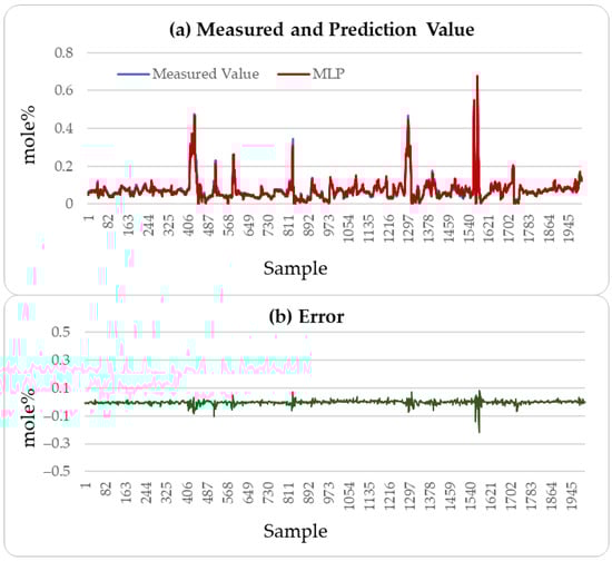 The soft sensor results for the outlet MAPD concentration are presented in Table 5. Using the first 6000 data points, corresponding to the pre-trained MVMS-MLP model trained on the initial 30,000 min of data, the MSE for the MAPD concentration of the testing set was 6647.8. This was compared with the results from the MVMS-LSTM and MVMS-GRU models. During incremental learning on the pre-trained model, the MAE and MSE for MAPD concentrations began to decrease significantly.