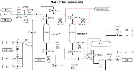 The sampling intervals for the process are set at 5 min, with the average value calculated every five minutes. The MAPD hydrogenation reactor is depicted in Figure 7 with detailed descriptions, unit specifications, and other relevant information provided in Table 3.