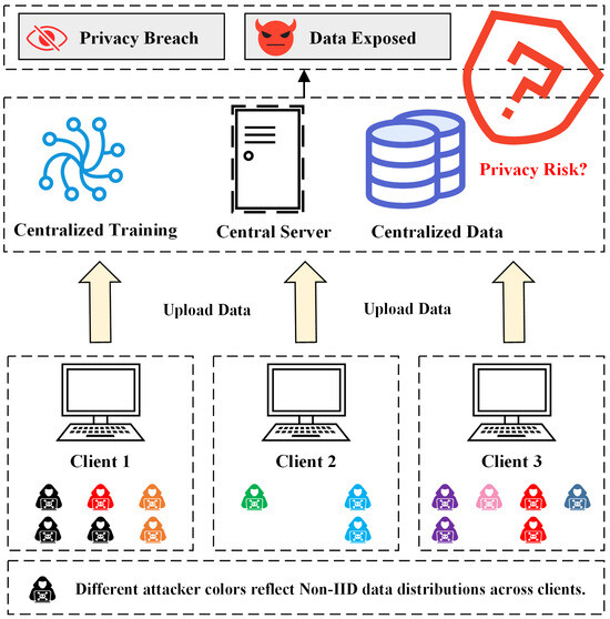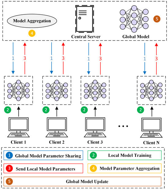 Intrusion detection systems (IDSs), as a crucial network security defense mechanism, have garnered extensive attention over the years. Especially driven by the swift progress of deep learning (DL), many researchers have employed DL-based models in IDSs to improve their effectiveness in areas like traffic analysis and anomaly identification [5,6,7]. Nevertheless, the applicability of traditional centralized learning (CL) in IoT scenarios is limited. CL generally depends on aggregating the vast data produced by IoT devices onto a centralized server to facilitate model training. This data-centralized processing poses significant threats to privacy-sensitive scenarios [8]. For instance, in intelligent healthcare systems, hospitals generate and store large volumes of highly sensitive patient data, including diagnostic images and treatment histories (particularly for critical conditions such as cancer [9]). Uploading such data to a centralized server for model training raises substantial privacy concerns—especially in the event of cyber-attacks that could lead to large-scale patient data breaches. Moreover, the transmission of high-resolution medical images and textual records imposes considerable pressure on both network bandwidth and system resources. Similar challenges have been observed in smart grid environments [10]. Smart meters deployed at the user end continuously record fine-grained electricity usage patterns, such as time-of-use distributions and appliance-level consumption frequencies. Studies have shown that such data can be exploited to infer household occupancy, activity patterns, and even family structure. If these data are centrally stored on utility provider servers, a successful cyber-attack or leakage may not only result in severe privacy violations, but also jeopardize the operational security and dispatch integrity of the power grid. To overcome these limitations, Google proposed the concept of federated learning (FL) in 2016 [11]. In contrast to conventional CL approaches, FL enables training processes to be conducted locally across distributed devices, transmitting only model parameters through communication networks instead of raw data. This approach effectively mitigates the risk of sensitive information leakage. Additionally, it reduces the communication overhead and energy consumption associated with large-scale data transmission [12].