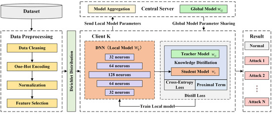 To overcome the challenges outlined earlier, this study introduces an FL-based IDS, named FD-IDS, which was designed for Non-IID IoT environments. Specifically, FD-IDS employs a deep neural network (DNN) as the classification model, leveraging its powerful nonlinear mapping capabilities to better capture complex intrusion patterns in IoT environments. To enhance feature quality, a mutual information (MI)-based feature selection method was introduced to filter high-dimensional traffic data, thereby reducing data dimensionality and computational overhead. In terms of the federated training strategy, FD-IDS integrates a knowledge distillation (KD) directly into the FL process. Unlike conventional approaches that typically design the distillation process as an offline or decoupled stage outside the training loop, FD-IDS embeds the distillation mechanism within each round of federated training. In this setup, the global model acts as a teacher, providing soft label supervision to the local student models during each communication round, thereby forming an interactive round-wise distillation process. This mechanism not only enhances the generalization ability of client models under Non-IID conditions, but it also improves the efficiency of information sharing among models. Furthermore, FD-IDS incorporates both the proximal term from the FedProx and the distillation loss function, establishing a dual regularization framework. Comprehensive experiments on both the Edge-IIoT and N-BaIoT datasets validated the effectiveness of FD-IDS. The primary contributions of this study are outlined as follows: