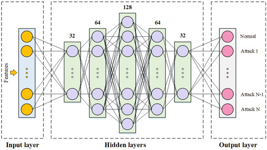 In the construction of IDSs within FL frameworks, the choice of the base classification model plays a pivotal role in determining the overall system performance. DNNs, with their superior feature extraction capabilities and ability to model complex nonlinear patterns, have emerged as an ideal choice for achieving efficient classification [38]. The DNN architecture employed in this study is depicted in Figure 3. It consists of an input layer, five hidden layers, and an output layer. The hidden layers are symmetrically arranged, with the number of neurons set to 32, 64, 128, 64, and 32, respectively. To enhance the model’s nonlinear representational capacity, each hidden layer incorporates the ReLU activation function. A softmax function is applied at the output layer to convert the final features into a probability distribution, allowing for accurate predictions in multi-class classification tasks. To optimize the model parameters, the Adam optimizer was chosen with a learning rate of 0.001.