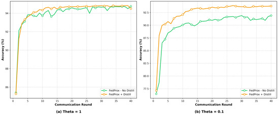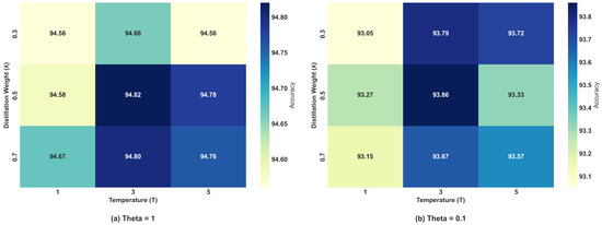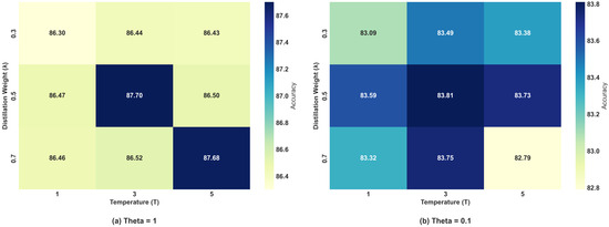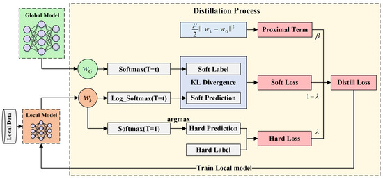 where and represent the logits of the teacher model (global model) and the student model (client model), respectively. The parameter T is a temperature factor that smooths the output probability distribution. By increasing the temperature T, the student model can capture finer-grained probabilities from the global model, enhancing its generalization capabilities. In this study, T was set to 3.